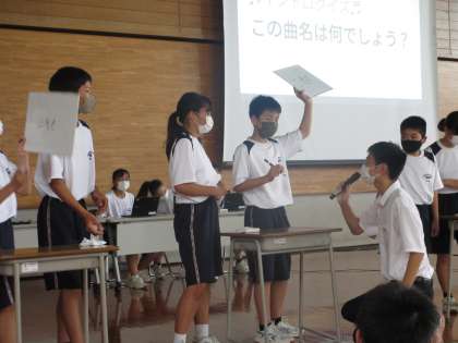午後は、生徒会主催の「岩中フェスティバル」です。前半はクラス対抗クイズ。イントロクイズや、教科書に出てくるキャラクターの名前クイズなど、1年生も積極的に答えて、みんなで盛り上がりました。