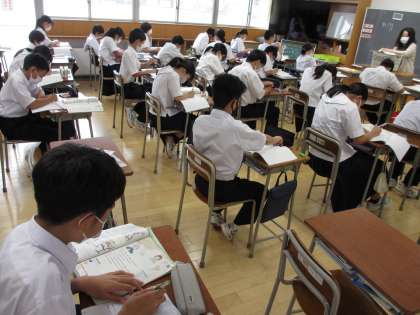 英語の授業では、学習した会話文をノートに書き写す作業に入るところでした。