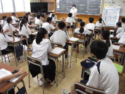 社会の授業では、自由研究の形式について説明がありました。生徒たちは「仮説」「方法」「結果」などの段階を、具体例を聞きながらイメージしていました。