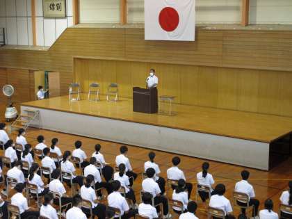 1学期最終日は受賞伝達、意見発表、終業式が行われました。受賞伝達では、陸上競技部、野球部、吹奏楽部が賞状を受け取りました。意見発表では、各学年の代表が堂々と発表しました。