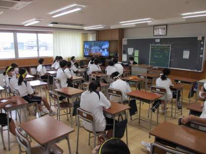 団演技のリハーサルは体育館で行うことになりました。交代で体育館を使用し、待っている間にオンラインで教室とつなぎました。