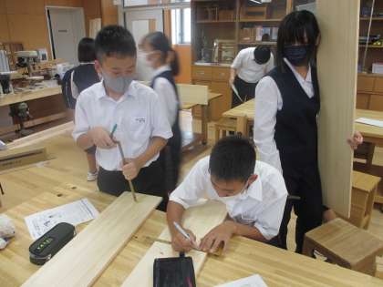 技術は木工作業をしています。本棚やラックなど、自分で使うものを作るそうです。今日は木材にけがきをしていました。