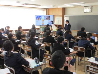 英語の授業では、友達を紹介するスピーチをしています。スピーチする人が「Hi!」「Hello!」と言うと、聞いている生徒たちも「Hi!」「Hello!」などと返していて、和やかな雰囲気でした。