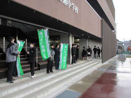 今日は1年1組があいさつ運動でした。生徒玄関や廊下で元気よくあいさつをかわしていました。