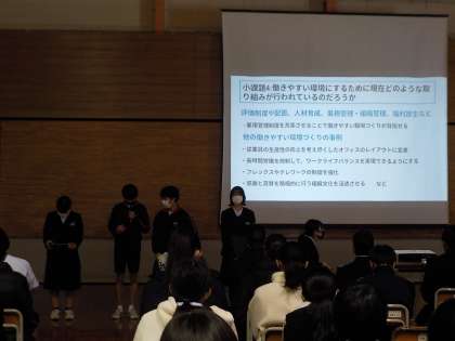 今日は、各クラスの代表のグループに発表をしました。スライドも見やすく、発表の仕方も工夫されていてとても素晴らしかったです。また、内容も将来の仕事を考えされる貴重な時間でした。