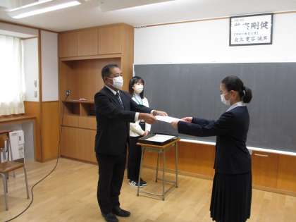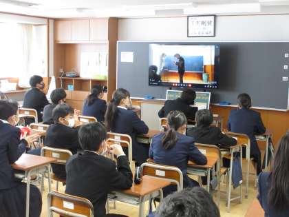 体育館が大変寒かったので、終業式はオンラインで教室を結ぶ形で行いました。最初は二学期の受賞報告会です。