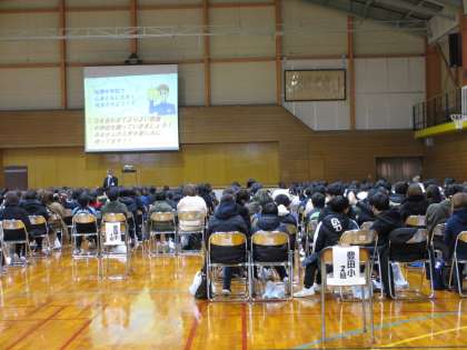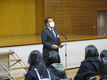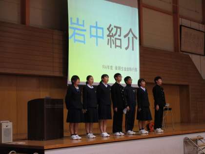 校長先生が「みなさんが4月に入学してくることを楽しみに待っています。」とあいさつされました。続いて生徒会執行部が中学校の生活の様子、部活動、制服など、学校生活について、写真や動画、実演を交えて紹介してくれました。