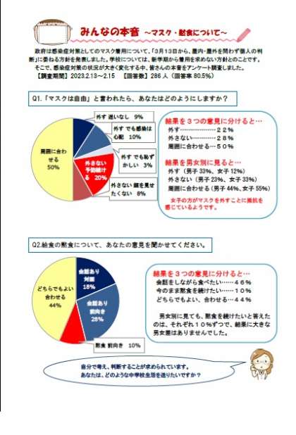 むし歯の治療状況、生徒へのアンケート調査結果(マスク・黙食)について掲載してありますのでご一読ください。
