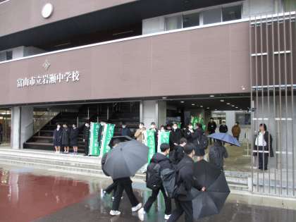 今日は雨です。1年2組にあいさつ運動の順番が回ってきました。