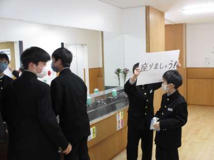 給食の準備中には、給食委員が着席を促す活動を始めました。廊下にいる人を見つけて積極的に声をかけてくれたおかげで、いつもより早く「いただきます」ができました。