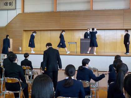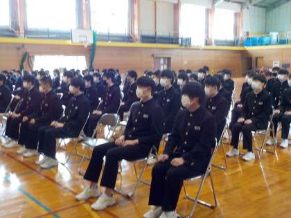 県立高校一般入試が終わり、緊張から解放されて和やかな雰囲気で卒業式練習に取り組んでいる様子です。