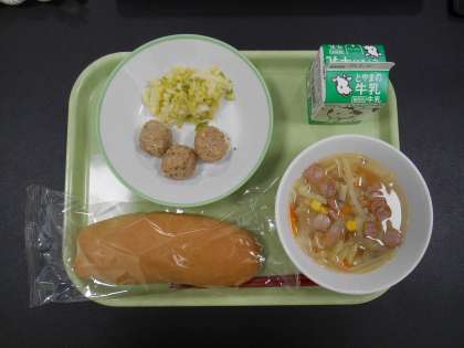 ライ麦パン、牛乳、フリカデレ(ドイツ風一口ハンバーグ)、ザワークラウト(キャベツの酢の物)、アイントプフ(具だくさんスープ)、