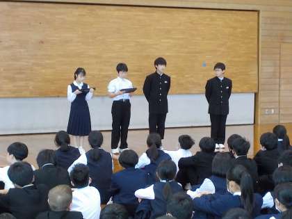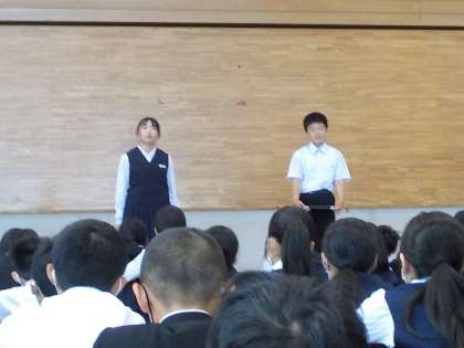 写真上:学級役員による学年目標の発表の様子