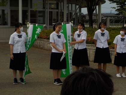 今日は、小中合同あいさつデーで、45名の生徒が豊田小学校で、小学生と一緒にあいさつ運動を行いました。