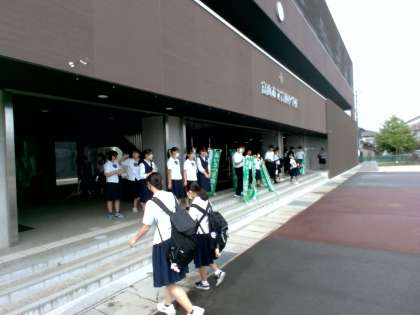 今日は、3年2組の生徒が生徒玄関前で、あいさつ運動を行いました。