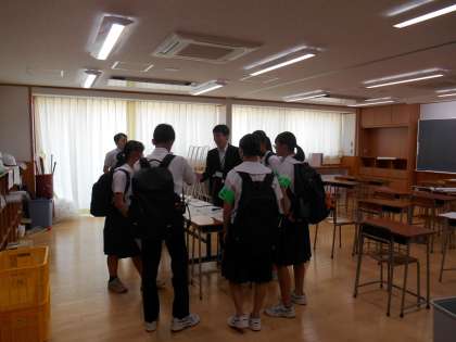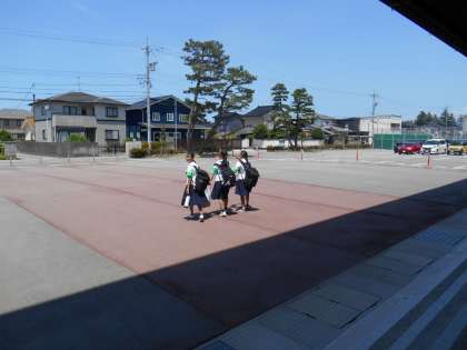 少し緊張した様子もみられましたが、「14歳の挑戦」の腕章をつけて、元気に学校を出発しました。