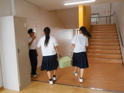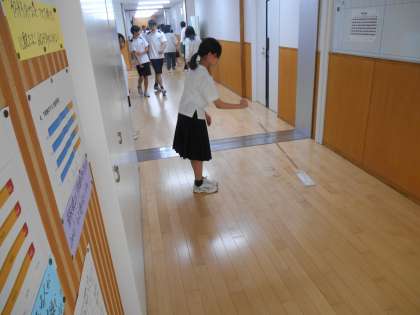 給食当番が食缶を返却する際、残食の汁がこぼれ、床がよごれることがありました。給食委員の生徒が要所に立ち、食缶を斜めにしないで運搬できるように呼びかけました。