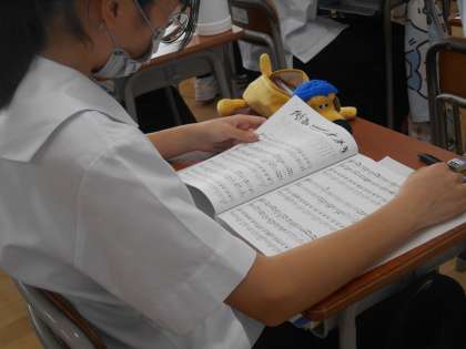 合唱曲集にある楽譜を見ながら、自分たちのクラスに合った曲を選ぼうとしている生徒もいました。今後、リーダー決めなども行います。