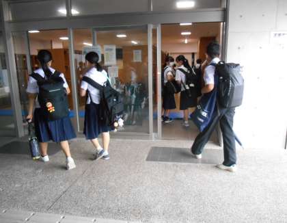 昨夜は大雨でしたが、今朝は雨もあがり、生徒たちは元気に登校してきました。今日は、たくさんの3年生があいさつ運動に参加していました。