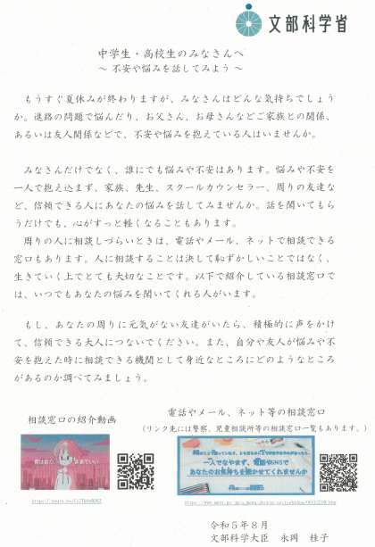 文部科学大臣メッセージ「〜不安や悩みがあったら話してみよう〜」
