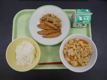 ごはん、牛乳、わかさぎのフリッター、香味和え、高野豆腐の卵とじ