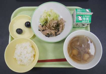 ごはん、牛乳、豚キムチ丼、ゆでキャベツ、茎わかめスープ、巨峰