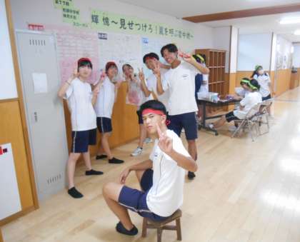 1階の廊下に、体育大会のスローガンと全校生徒一人一人の体育大会への想いが団ごとに掲示されています。