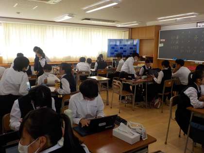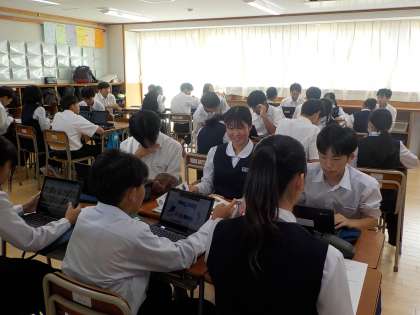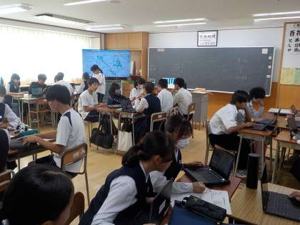 班ごとに個人課題の設定や班での目標を考え、クロムブックを使いながら金沢の見学コースの計画を立てていました。