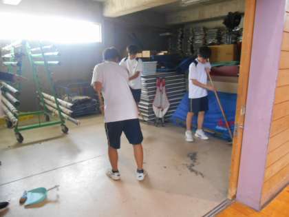 合唱コンクール実行委員のみなさんが、アルミのひな壇を運び出した後の器具庫を、男子バスケットボール部の皆さんが掃除してくれていました。