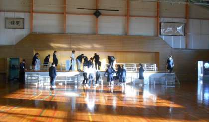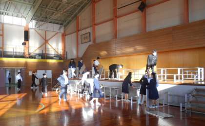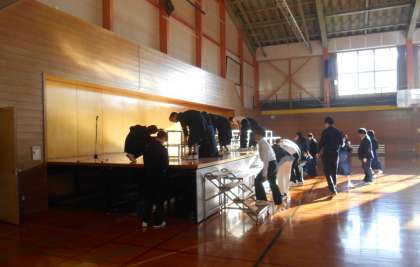 今日は、全学年が体育館でリハ−サルを行うため、合唱コンクール実行委員のみさなんが、朝早くからアルミひな壇の設営など、協力して会場準備を行っていました。ご苦労さまです。ありがとう。