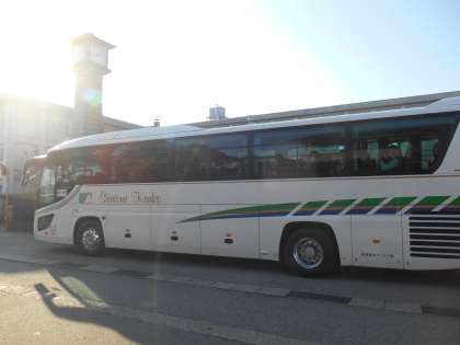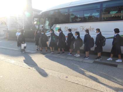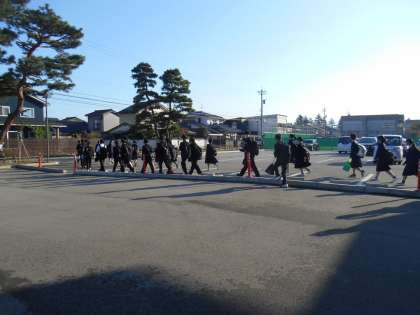 3年3組の生徒たちが授業会場の呉羽中学校に向けて、元気に旅立っていきました。