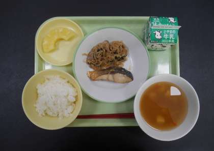 今日の献立は、「ごはん、牛乳、ふくらぎの西京焼き、しらたきのピリ辛炒め、白玉汁、パインアップル」です。