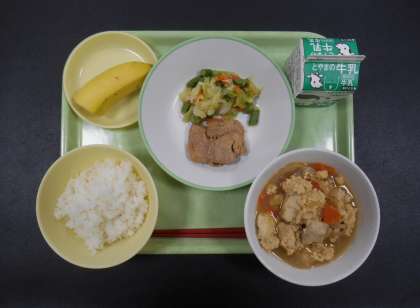 今日の献立は、「ごはん、牛乳、照焼きチキン、野菜ソテー、厚揚げの錦とじ、バナナ」でした。