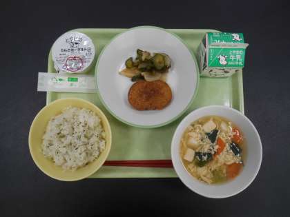 今日の献立は、「菜めし、牛乳、とやまミートコロッケ、とろろ昆布和え、かきたま汁、りんごヨーグルト」です。