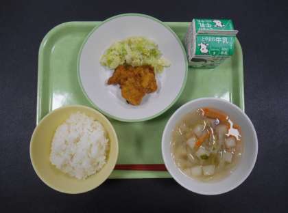 今日の献立は、「ごはん、牛乳、ポークパコラ、ゆでキャベツ、かぶのスープ」です。