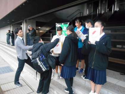 赤い羽根共同募金は、人権週間の活動の一環として、生徒会執行部が行っています。募金に協力してくれたみなさんに「ありがとうございます」と明るい声で伝えていたのが印象的でした。