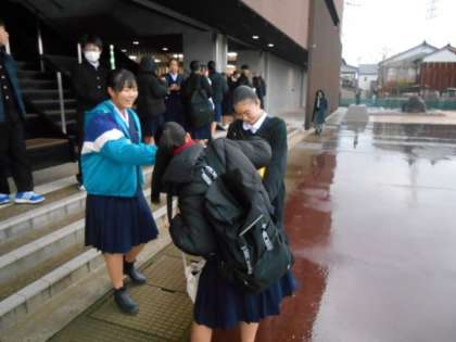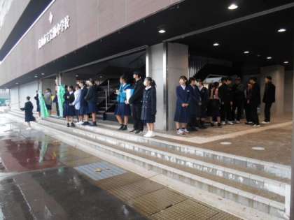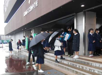 雨にもかかわらず、朝早くから正面玄関の前に立ち、登校する生徒たちに「おはようございます」と元気よく挨拶をしていました。