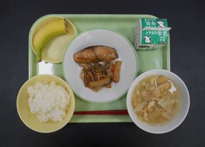 今日の献立は、「ごはん、牛乳、ふくらぎの照り焼き、茎わかめのきんぴら、具だくさん汁、バナナ」でした。