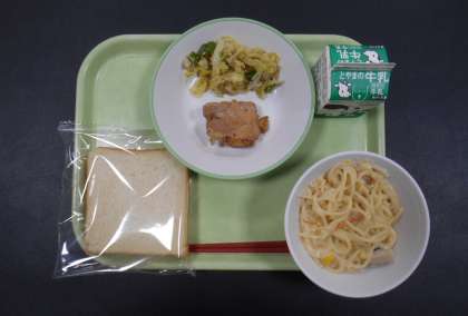 今日の献立は、「食パン(減量)、牛乳、照焼きチキン、切干大根のサラダ、クリームスパゲッティ」でした。
