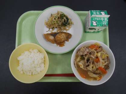 今日の献立は、「ごはん、牛乳、揚げ魚のみぞれだれ、昆布和え、はくさいなべ」でした。