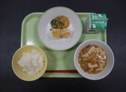 今日の献立は、「ごはん、牛乳、にんじんシューマイ、大根ナムル、マーボー豆腐」でした。