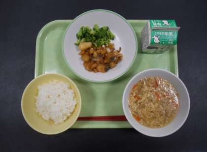 今日の献立は、「ごはん、牛乳、魚と大豆のねぎソースからめ、ゆでブロッコリー、中華かき玉汁」でした。