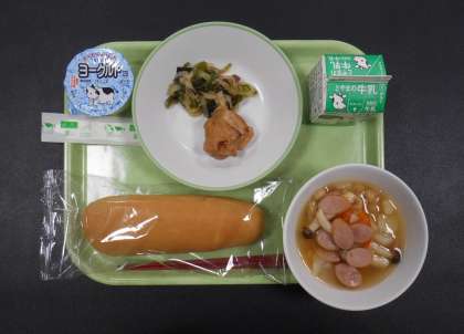今日の献立は、「米粉コッペパン、牛乳、照焼きチキン、海藻サラダ、豆ときのこのスープ煮、ヨーグルト」でした。