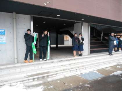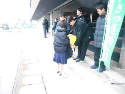 雪がまだ残る寒い朝でしたが、元気な声であいさつを行っていました。