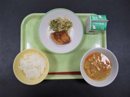 今日の献立は、「ごはん、牛乳、豚肉のかおり揚げ、梅肉和え、みそ汁」でした。