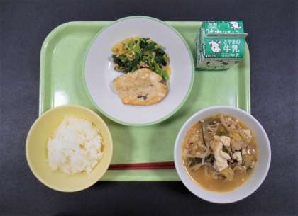 今日の献立は、「集中力アップ献立」で、「ごはん、牛乳、さばの塩焼き、ねばーる納豆和え、全集中ごまキムチ鍋」です。