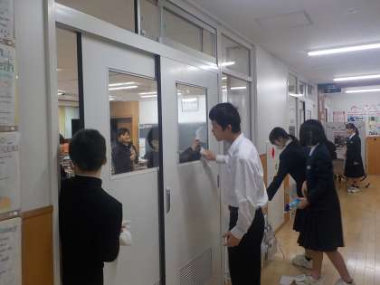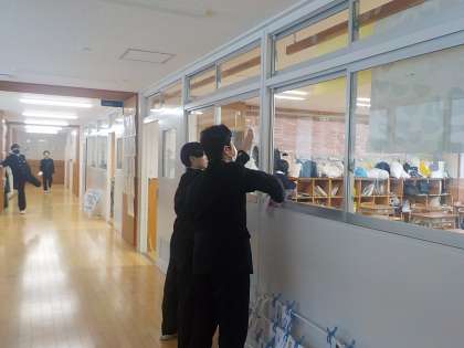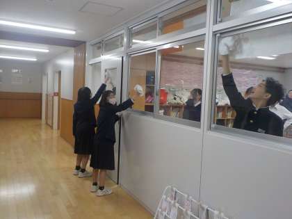 朝、環境委員会主催の「ちょボラ隊」の活動で「窓拭き」を行いました。
