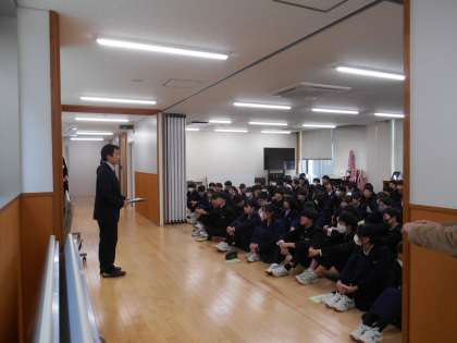 3年生は、5限に明日の私立高校一般入試に向けて、激励会を行いました。学年主任の先生からは、緊張したときのリラックス法も教わり、みんなで一緒に実際にやってみました。