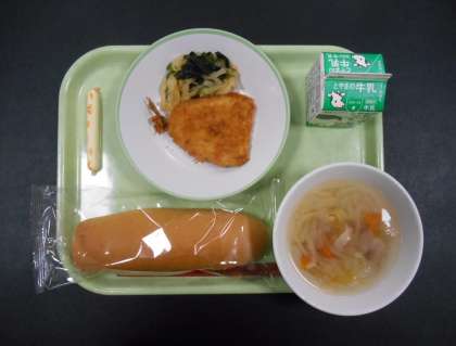 今日の献立は、「コッペパン、牛乳、あじフライ、大根サラダ、マカロニスープ、棒チーズ」でした。