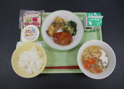 今日の献立は、「ごはん、牛乳、はりはり和え、具だくさん汁」と
